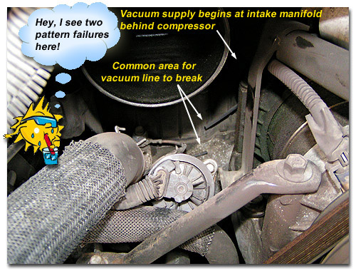 It's our experience, if you find a break in the vacuum line as depicted in the photo above, you may have to replace a large section, as most of it could be very brittle and break easily when trying to make repairs. On the 1998 model that we photographed, we found it easier to remove the cowl, as the entire section needed to be replaced. The supply source is behind the compressor on this model, and may be difficult to reach without removing the engine cover. At the very least, if attempting to reach behind the compressor, make sure the engine has completely cooled down.