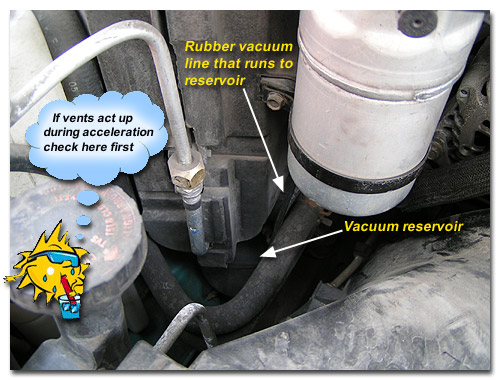 There are two common things to look for. One is the rubber vacuum hose to the vacuum reservoir. Our first photograph here shows the location of the vacuum reservoir. It?s a plastic ball hidden under the evaporator box on the passenger side of the engine compartment along the frame rail. You should find a single rubber hose connected to the ball. It acts as a reservoir when vacuum supply is low, like during uphill driving. It?s common for the vacuum line to come loose from this reservoir. You may find it just hanging. We see this most often after alternator replacement since these vacuum lines run very close to the alternator.